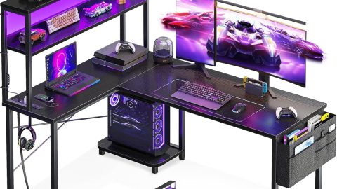 AODK 53″ L Shaped Gaming Desk with LED Light, Power Outlet & Storage